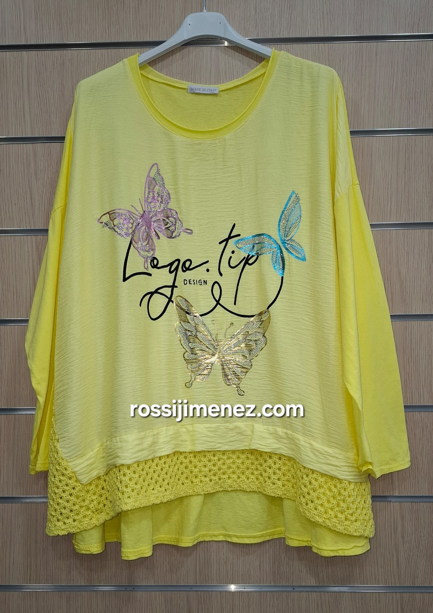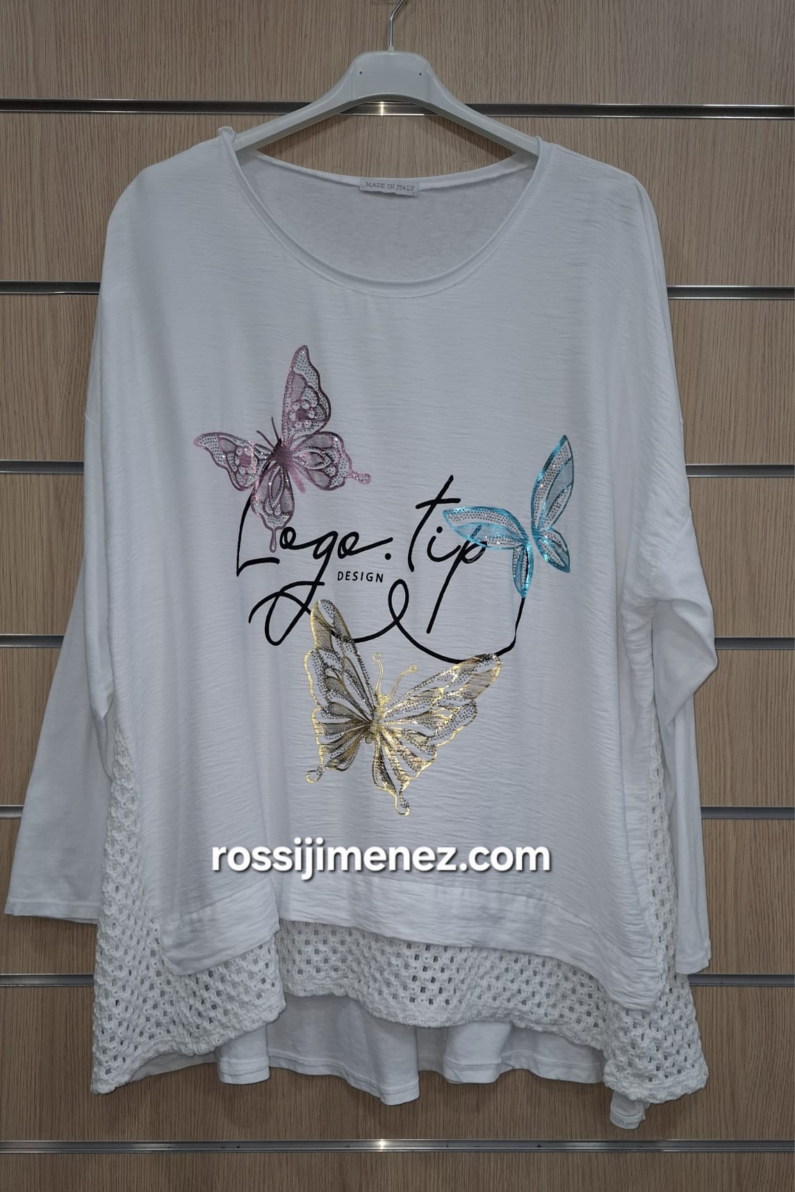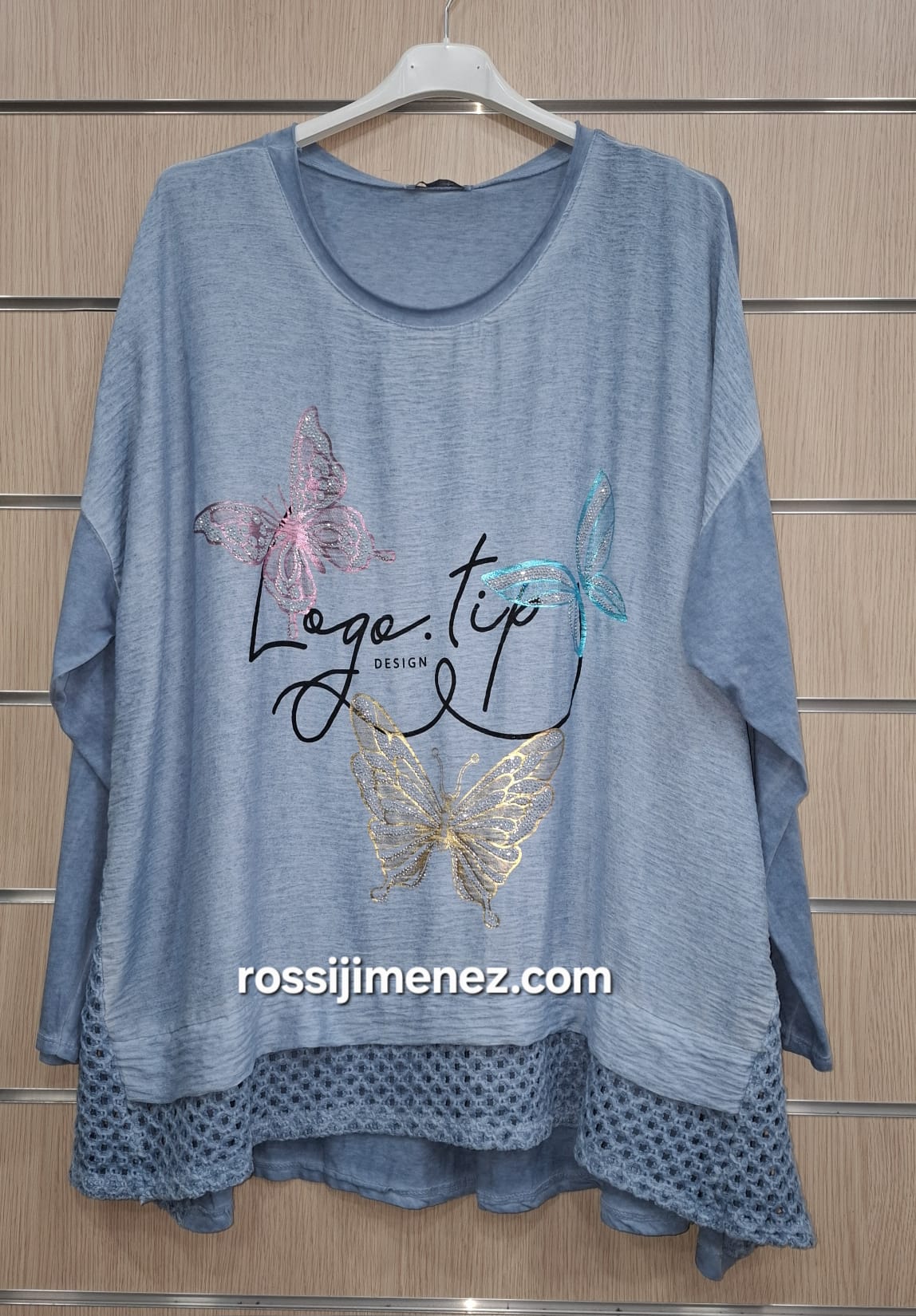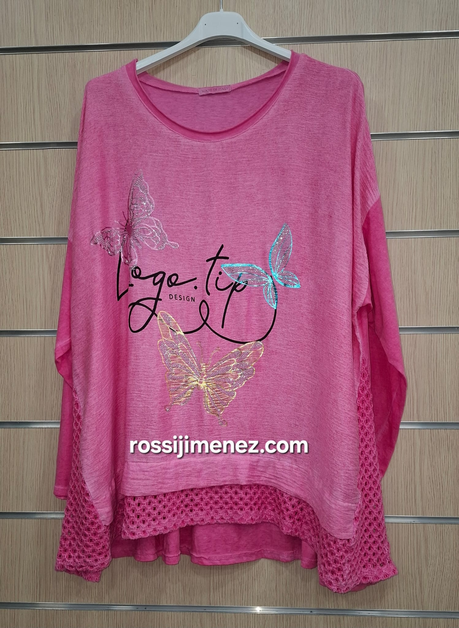 Camiseta diseño original acabado el bajo y el lateral en crochet con forma evasé para darle más amplitud a la cadera.